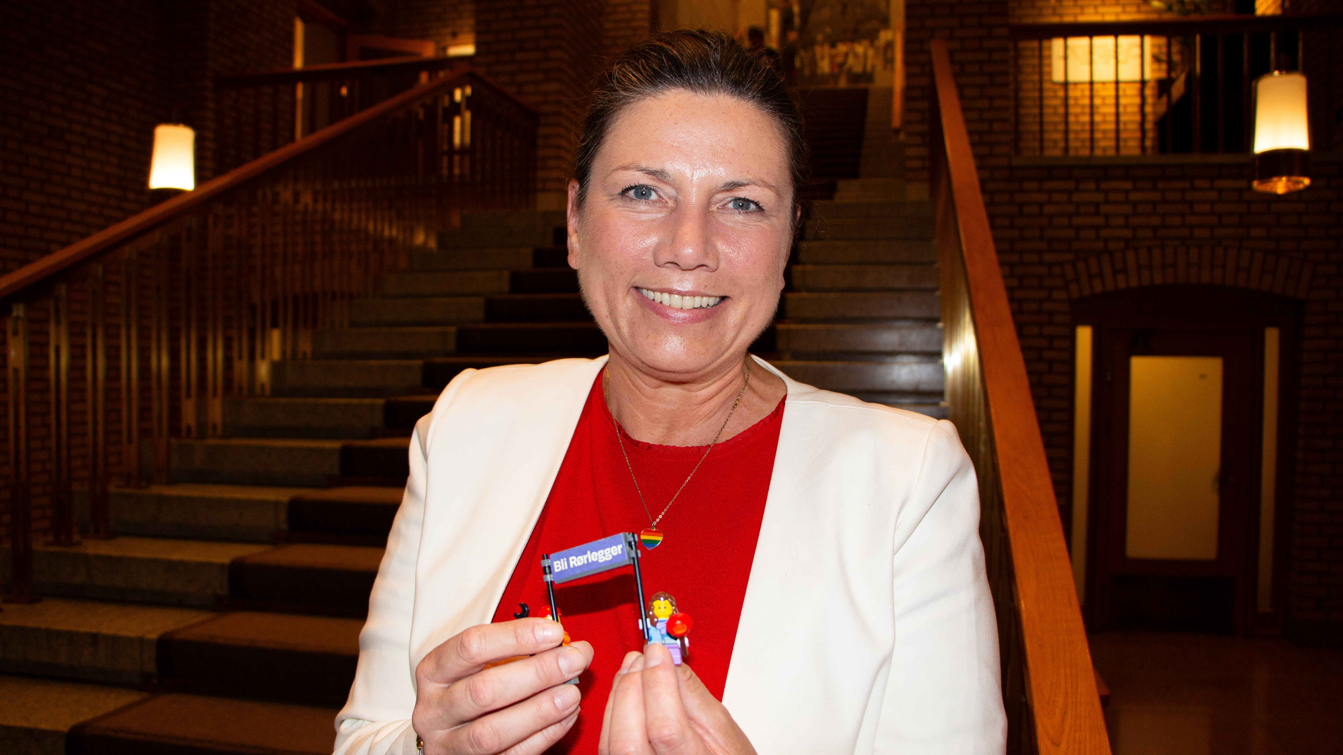 Rørleggere lenker seg fast til Stortinget – Dette er stas for en rørleggerdatter, ler Heidi Nordby Lunde og gir rørleggerjenta og rørleggergutten i lego en strategisk plass foran lego-kopien av Stortinget.